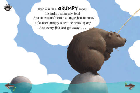 As for the level of interaction – the whole reasoning behind my study – I have tried to emulate the likes of The Very Hungry Bear app in as far as levels of interactivity on a page/scene. approximately 2-3 user-activated interactions occur on each page. In the instance of the image below, the bear moved and the water moved upon tapping the screen.